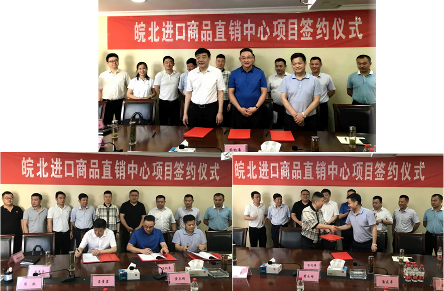On the morning of June 5th, 2019, the signing ceremony of the cooperation project was held in the conference room of the Economic Development Zone of Mengcheng County of Bozhou. Huang Yongzeng, President of Ningshing Holdings, Wang Jiaji, Director of Anhui Mengcheng Economic Development Zone Management Committee, and Zheng Yi, Chairman of Xingmeng Investment Co., Ltd. of Mengcheng Development Zone, signed the contract on behalf of the three parties. At the same time, Ningshing Haixin, the specific executor of the project, signed a cooperation agreement with the local Zhuangzi Import and Export Trading Co., Ltd. The two parties would co-funded Anhui Ningshing International Trading Co., Ltd. and jointly operate the Yubei Import Direct Marketing Center project.